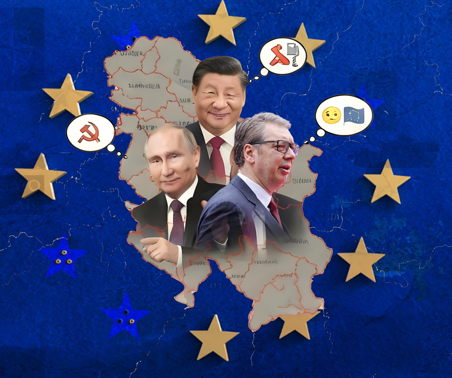 Serbia është ajo fqinja që gjithmonë thotë se po përgatitet për darkë me Europën, por ashtu si padashur, në mbrëmje e gjen në shtrat me Rusinë dhe Kinën. Një vend që në letër është kandidat për anëtarësim në BE, por në praktikë sillet si një “dashnore e pamend” që nuk di kë të zgjedhë: dashurinë e vjetër me Moskën apo flirtin e ri me Pekinin.